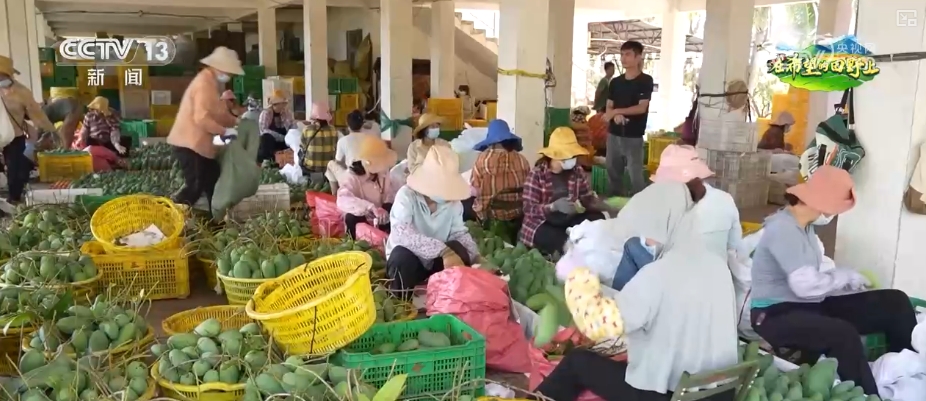 正在三亚海棠区南田农场的芒果种植,成片的果林绿意盎然,轻飘飘的果实压弯了枝头,果农们穿越林间忙着采摘、分拣、打包。