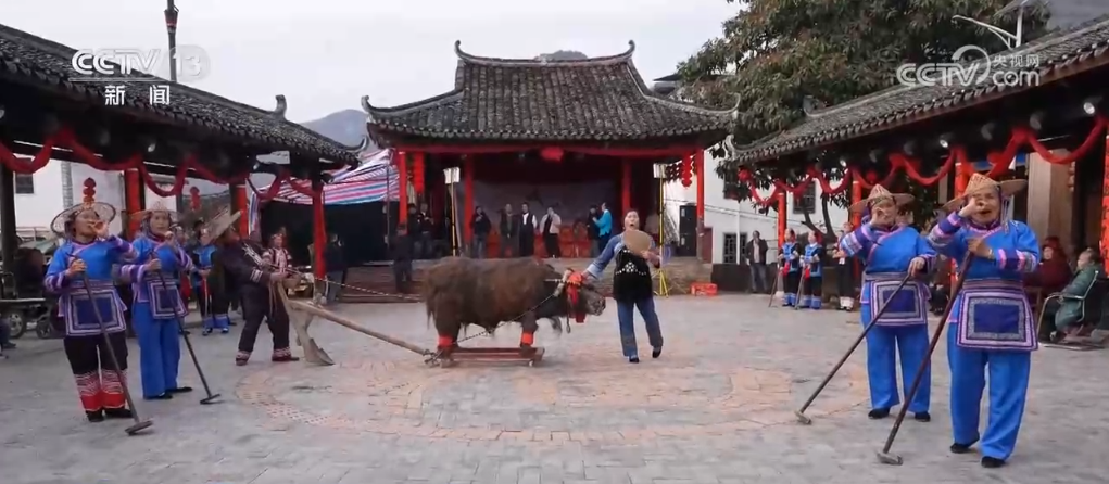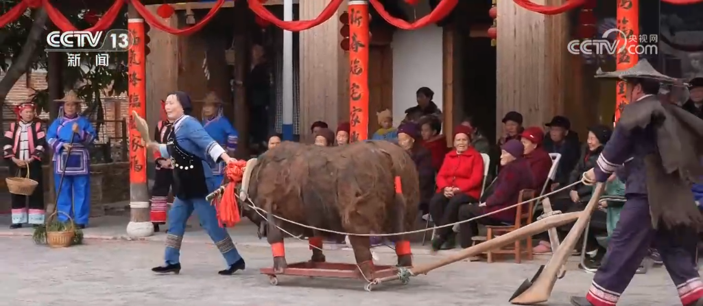 正在广西富川瑶族自治县朝东镇福溪村,村平易近穿上平易近族服拆,构成“耍春牛”步队,正在村里的广场进行表演,仿照耕田、播种等劳动场景,而“春牛”则是用竹扎框架、牛皮、棕榈叶制做而成的。