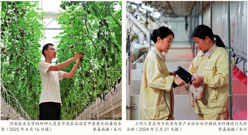 正在保障粮食平安的前提下,河南不竭提高农业质量效益和合作力,努力实现粮食平安和现代高效农业相同一。河南现代高效农业正派历从机械化到数字化、从经验驱动到数据驱动的底子性改变。正在内乡县的牧原肉食财产分析体,21栋养猪大楼林立,这里每年出栏生猪210万头。智能巡检机械人是每栋楼里“最靓的仔”,它能够24小时不间断地收集温度、湿度、猪群体征、猪群非常声音等14项目标,并及时传送到云平台,及时预警,推送处理方案。“哪怕有猪呈现咳嗽,巡检机械人也会亮起灯,提示豢养员查看。”牧原集团智能化使用担任人胡义怯说。智能环控、智能饲喂等系统让猪住得舒服、吃得健康。“2011年,公司起头消息化摸索,2019年成立了专业智能化团队,通过云、大数据阐发和从动化设备运转,实现对生猪养殖的聪慧办理。”胡义怯说。据悉,牧原集团2024年出栏生猪7160万头,满脚超1亿人的猪肉需求,间接创制14万个就业岗亭。近年来,河南通过培育新品种、改善设备配备、引进集约化养殖手艺等手段不竭加强畜牧业供应保障能力和市场所作力。加速畜牧业种业复兴。先后培育出夏南牛、豫南黑猪、黄淮肉羊、豫粉1号蛋鸡等畜禽新品种(系)。加快畜牧业工业化、设备化。目前全省年出栏5万头以上生猪养殖场中,从动化饮水已实现全笼盖,全程机械化饲喂率达97%;百头以上奶牛场中,90%以上配备了喷淋、电扇等降温设备设备,82%实现了全程机械化饲喂;50万只以上肉禽场和10万只以上蛋禽场中,90%实现了全程机械化饲喂,88%实现了从动化节制。鞭策高效集约化养殖,进行数智化办理。全省100%的根本母猪、95%的母牛采用人工授精配种手艺,规模奶牛场精准饲喂手艺普及率达90%以上。畜牧业出产效率大幅提高。2023年,全省参测奶牛单产提拔至9。7吨,较2019年提高1吨。牧原公司位于南阳市内乡县的6层全智能化生猪养殖,1名豢养员年可豢养商品猪1万头,取保守养殖场比拟,单元地盘产出率提高了4。3倍,劳动出产率提高了5倍以上。2024年,河南省肉蛋奶总产量1337万吨,全年实现畜牧业产值2610亿元,同比增加1。8%,为丰硕国平易近餐桌做出了主要贡献。正在信阳市潢川县“将来农场”,楼顶的玻璃温室里,无土栽培的彩色西红柿挂满枝头,西红柿的藤蔓沿着绳子能爬三米高,一茬接一茬地出产西红柿,整个采摘季跨越六个月,亩产远远高于保守农业种植。“将来农场”场长张祺恺告诉记者,农场采用无土栽培,温度、湿度、二氧化碳浓度、水肥等都是智能节制的。正在这栋建建的一楼,“将来农场”数字化从管闫李明正通过电脑节制着能源、环控、水肥、通风等系统。“电脑上能看到农场表里3000多个点位的数据,包罗西红柿发展的养分基质的温度、湿度、酸碱度,我们还会适量向农场内弥补二氧化碳,以提高光合感化效率。”闫李明说。目前,河南省设备蔬菜根基构成了豫南地域塑料大棚为从的初春和晚秋菜,豫北日光温室为从的冬春菜,豫东、豫中地域温室取大棚并沉的冬春和早秋菜。2025年,设备蔬菜面积将提高10%以上,确保“菜篮子”产物愈加丰盈。正在通许县酸辣粉财产园,从动化流水线快速运转,红薯淀粉颠末20多道工序后,变身为一桶桶酸辣爽口、甘旨健康的酸辣粉……每天200多万桶酸辣粉从这里人们的餐桌。通许县酸辣粉财产成长专班担任人李振举告诉记者,截至目前,全县酸辣粉财产有规上企业23家、酸辣粉相关出产线万人次,已建成全国最大的酸辣粉出产加工。河南借帮“豫农优品”公共品牌,通过基金投资、供应链办事、项目合做、财产共建等体例支撑特色农产物做强做优,提拔品牌价值。河南农业投资集团操纵具有基金、安全、农业供应链办事等投融资全功能劣势,深化产融连系,投资了漯河绿色食物、原阳预制菜、通许酸辣粉、杞县大蒜、西峡喷鼻菇、正阳花生、三门峡果业、南阳艾草等,搀扶处所特色劣势农业做强做优做大,下一步将通过打制“+企业+金融”共赢生态,鞭策“豫农优品”品牌影响力进入全国第一梯队。河南鞭策建立联农带农益农长效机制,财产帮扶到乡到村到户,把农业财产链的增值收益、就业岗亭尽量留给农人,让农人群众正在口有活干、有钱挣。2024年,全省农村居平易近人均可安排收入21330元,同比增加6。4%。