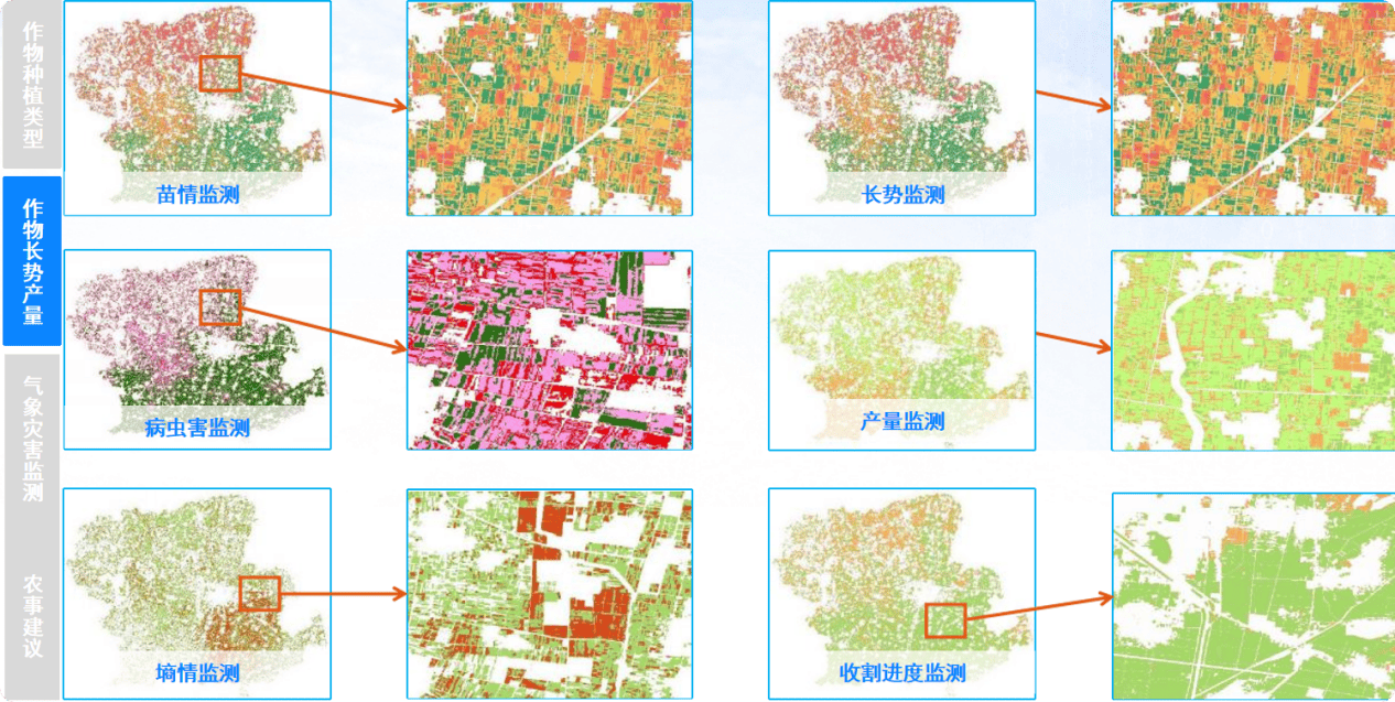 2。 做物长势产量借帮遥感监测手艺,能够及时监测做物的长势环境。通过对植被指数、土壤湿度等目标的阐发,及时发觉做物发展过程中的问题,如病虫害、缺水、缺肥等,为精准施肥、灌溉和病虫害防治供给决策支撑,从而提高做物产量和质量。
