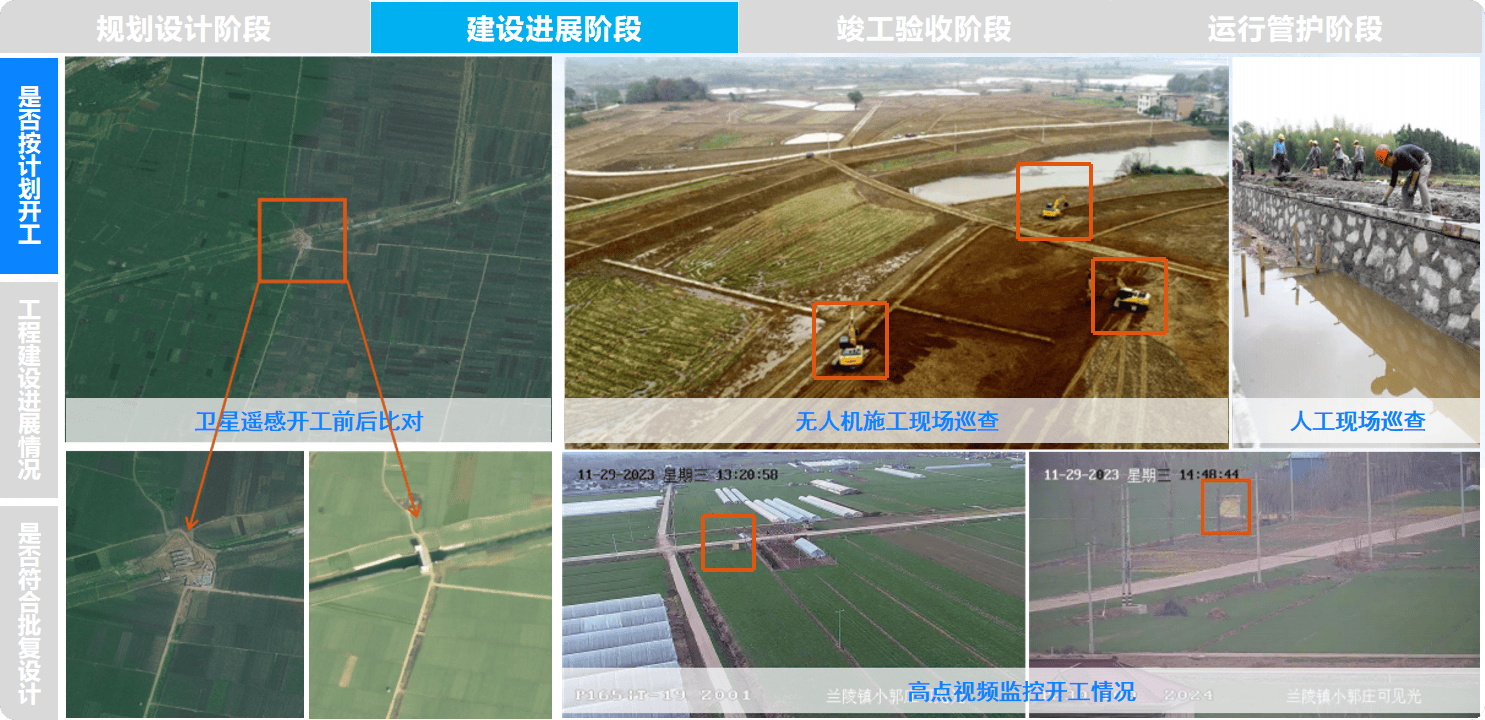 2。 施工扶植阶段,遥感监测手艺阐扬着“监视员”的感化。从“设备角度”,细致展示每个项目农田根本设备的及扶植进度。通过高点视频,能够及时查看单个农田根本设备的扶植进展环境。正在此根本上,按照农田根本设备的分布,进行无人机航路规划,进行空中视角的扶植进度详查,实现地-空监测体例的联动,确保施工质量取进度双达标。