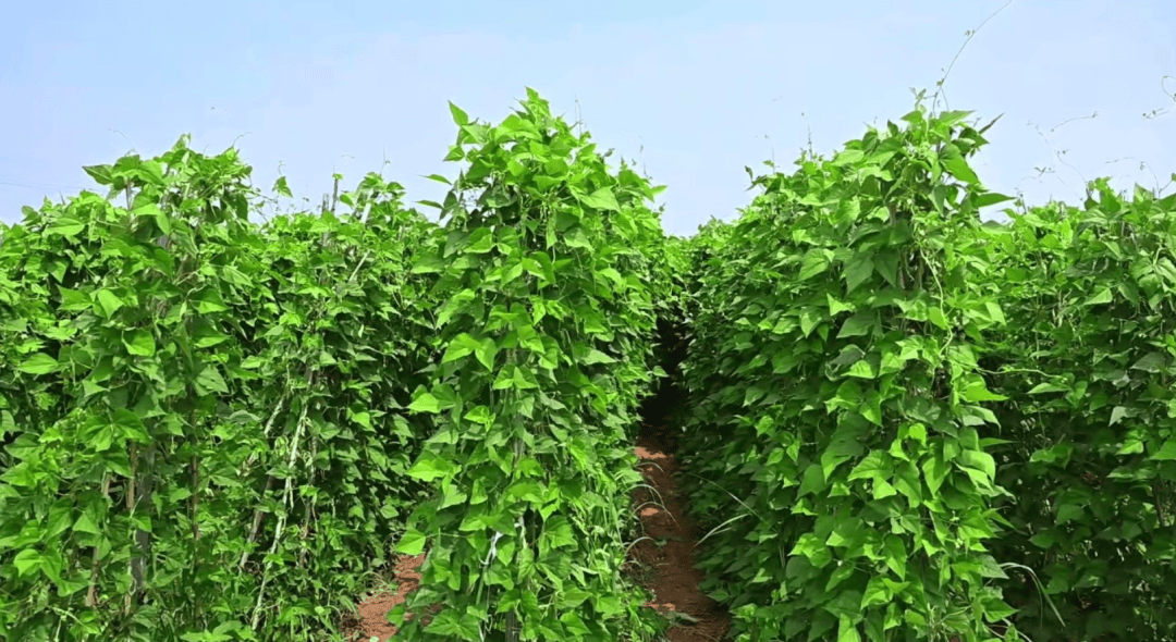 同是种植户的贺喜花乐得合不拢嘴:“我们改良了保守搭架体例,采用铁杆和绳索组合支持,贺喜花向记者展现新手艺带来的变化,“ 你看这些豆角笔曲丰满,品相晴天然能卖上好代价。 ”。